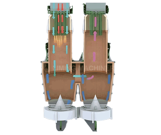 El horno de doble eje calcina la piedra caliza utilizando dos cámaras. El eje A y el eje B están conectados en la parte inferior de la zona de calcinación, y el material se desplaza hacia abajo a través de ambos ejes. Durante la calcinación en el eje A, el aire de combustión y el combustible fluyen en paralelo al material en el eje A, lo que permite que la llama caliente entre en contacto con el material más frío y altamente endotérmico. Por el contrario, los gases de combustión, a una temperatura relativamente más baja, interactúan con el material calcinado progresivamente, lo que permite obtener condiciones de calcinación uniformes y una alta eficiencia térmica. Los productos de la combustión y el CO₂ liberados por la descomposición del material pasan a través del canal de conexión al eje B. En esta fase, el eje B actúa como cámara regenerativa, donde la piedra caliza del interior absorbe el calor de los gases de escape, mientras que estos se enfrían hasta alcanzar una temperatura relativamente baja. El material almacena calor, que luego se utiliza para precalentar el aire de combustión para el siguiente ciclo. En esta configuración, el eje A sirve como eje de combustión, reflejando la característica de flujo paralelo, mientras que el eje B funciona como eje regenerativo con propiedades de almacenamiento de calor. En el siguiente ciclo, las funciones se alternan: el eje A se convierte en la cámara regenerativa y el eje B se convierte en el eje de combustión. Esto permite la calcinación continua de la piedra caliza.